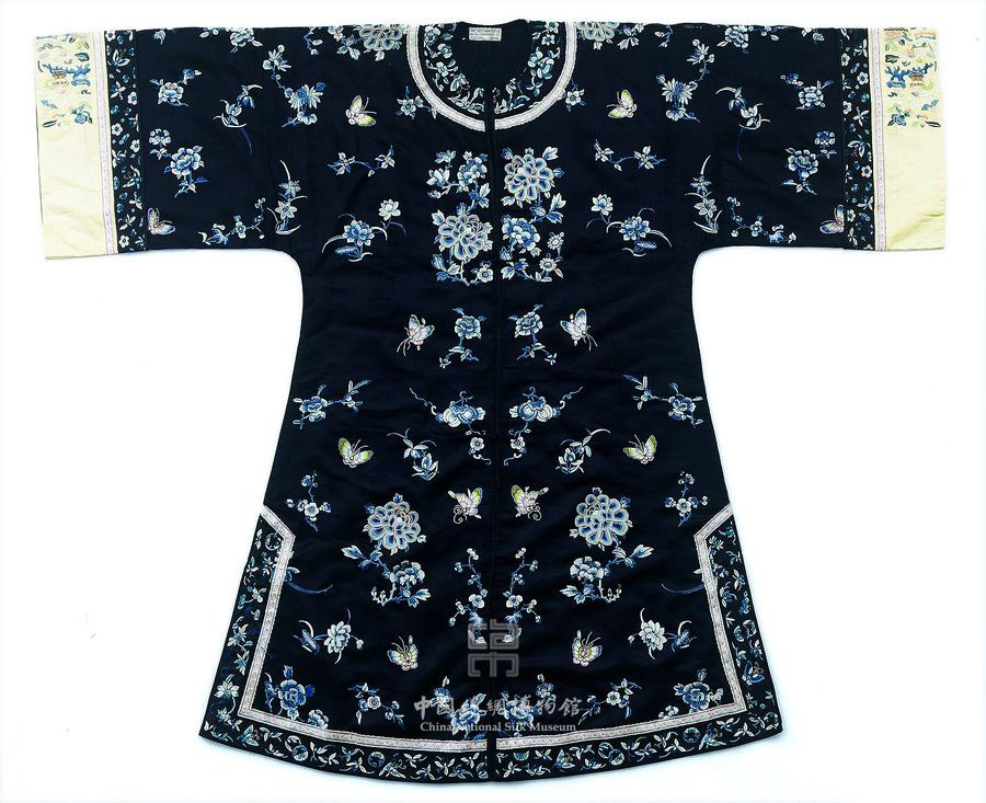 简介:褂为对襟、一字扣、圆领,领边缀有云肩,袖头、下摆及开衩处为彩绣花边。整件衣服为黑色缎地,主纹以红、淡红、蓝色丝线绣出菊花、牡丹花、葡萄以及各种花卉纹。针法为平针绣。此类款式多为富家女子穿用。