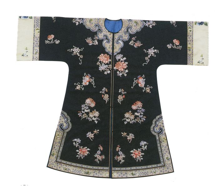 简介:褂为对襟、一字扣、圆领,领边缀有云肩,袖头、下摆及开衩处为彩绣花边。整件衣服为黑色缎地,主纹以红、淡红、蓝色丝线绣出菊花、牡丹花、葡萄以及各种花卉纹。针法为平针绣。此类款式多为富家女子穿用。