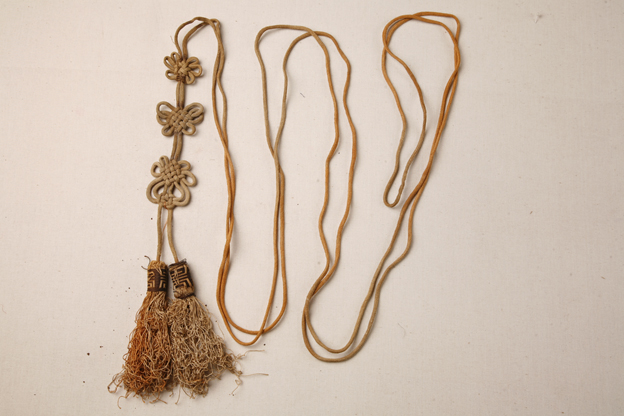 描述:此带使用时系于腰间,以丝带编结而成,下方为三个中国结,下垂两个穗子。