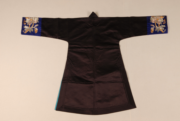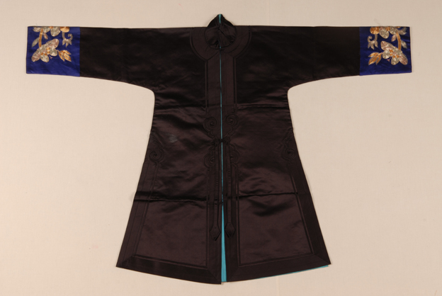 描述:该女褂,对襟、窄袖,左右开衩,加绣袖头。所用面料为石青所缎,内衬浅蓝色绢。襟缘及开衩处用大朵云头,制作精美。此件长衫为男子服用,圆领,对襟,长袖,前后左右各有开衩,衣身较为宽大,使用五颗盘扣。衣服使用石青色素缎为主要面料,以蓝色素绢做衬里。