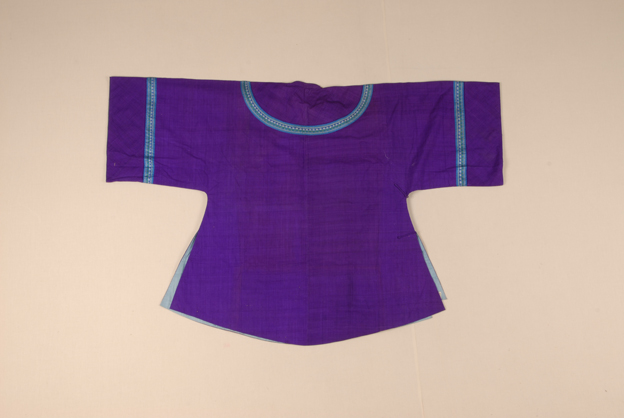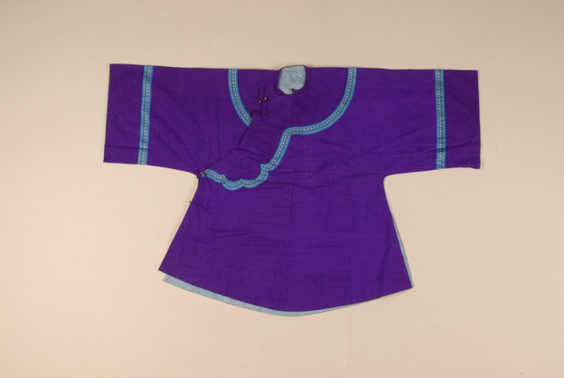描述:此件女衫立领,大襟,宽袖,两侧开衩,衣身宽大。衣服使用紫色丝布为主要面料,以平纹组织织成。领口与袖口等处用花边装饰,有衬里,以蓝色素绢制成。