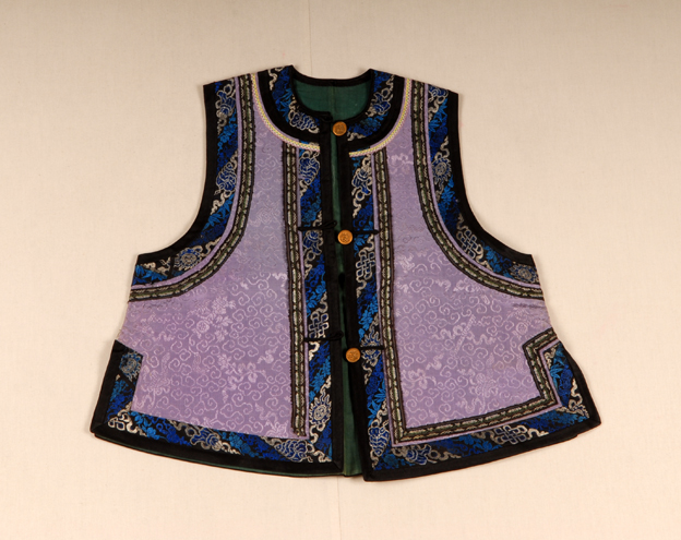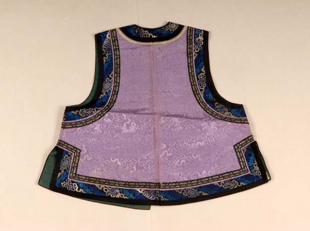 描述:此款女马甲为圆领、对襟、三粒扣,雪青暗八仙绸心,袖窿、门襟、底边各镶三道边,最外道为黑色,中间一道有花卉与佛教八宝相间的纹样,里道为小花纹机制绦边,右襟处有部分脱落。