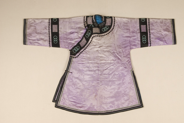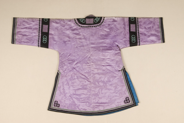 描述:此件女袄立领,大襟,两侧开衩,夹绵,以蓝色素绢做衬里。衣身以紫色暗花缎做主要面料,图案为大朵花卉纹样。襟边、袖中部镶贴黑缎一道,并在上面用蓝色缎盘贴出三个套环。