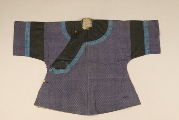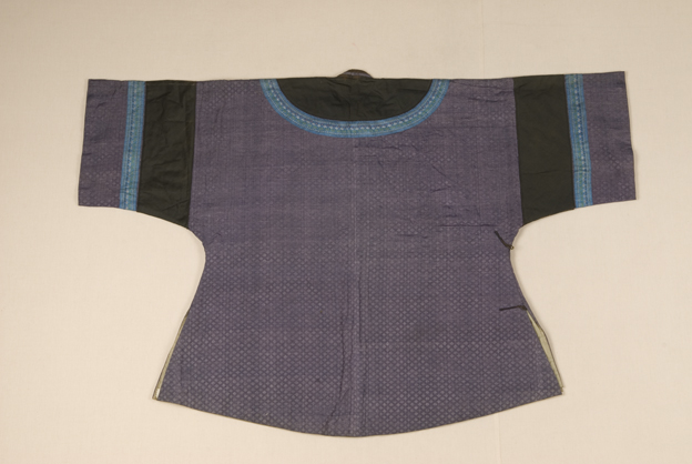 描述:该袄,圆领右衽,圆下摆,一字扣。面料为蓝藕闪色小菱纹绸,内有夹绵。领缘和袖口镶有黑边和蓝色小绦带。