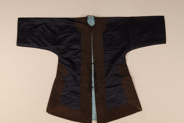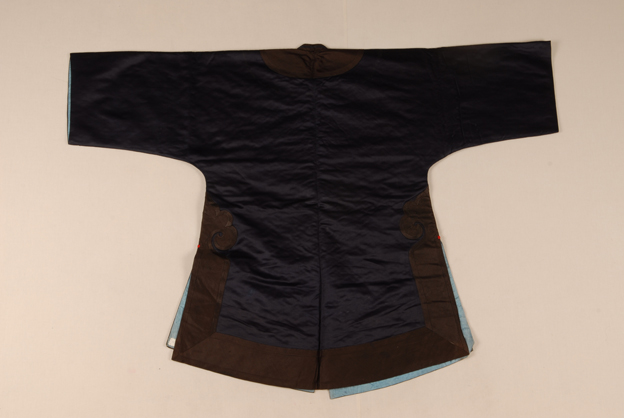 描述:此件女褂对襟,宽身,收腰,两侧开衩,门襟处有飘带二。衣身的主要面料为石青色素缎,使用蓝色素绢作衬里,领口、门襟、下摆等处贴缝缎织物,开衩处贴缝出如意头纹饰。