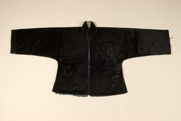 描述:此女上衣为立领、对襟、平袖、盘扣。面料为黑色丝绒,衬里为月白色。