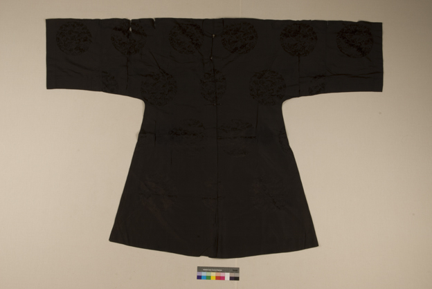 描述:该长袍,圆领、对襟、平袖,一字扣。所用面料为褐色暗花绸,纹样为二二错排的团窠鹤鹿同春纹,团窠直径为20cm。