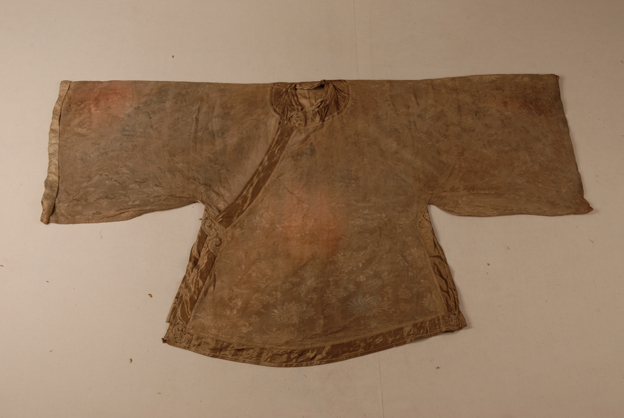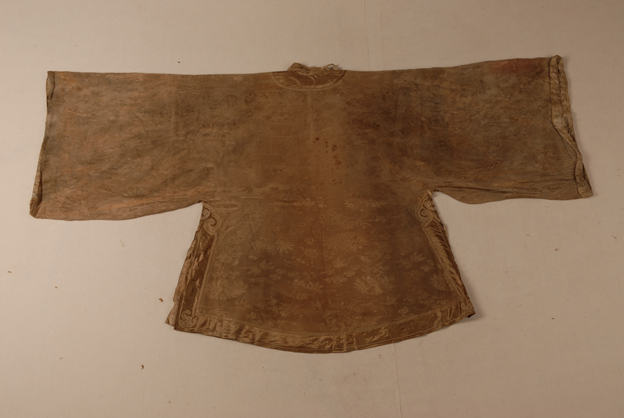 描述:此件女棉袄为立领、右衽,广袖、左右开裾。领、襟、开裾、底均镶边,在开裾端镶有如意头。面料为梅兰竹菊纹绉绸。