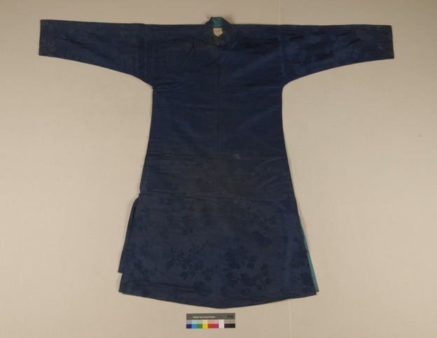 描述:此款男袍立领、大襟、窄袖、六枚扣、下摆略宽,两开裾。面料为宝蓝色折枝牡丹、海棠暗花绸,寓意“满堂富贵”,其基本组织为2/1右斜纹地上起1/5右斜纹花,有衬里。