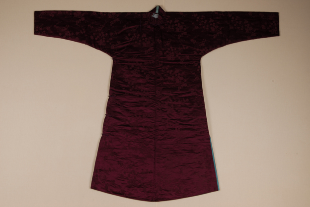 描述:此件长袍使用葡萄纹暗花缎织物为主要面料,中间衬棉,应为冬季穿着。