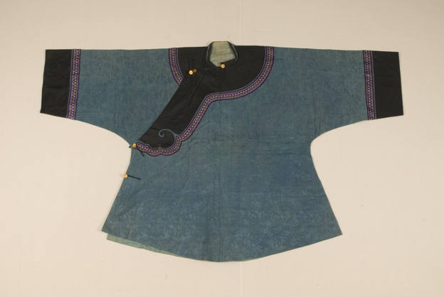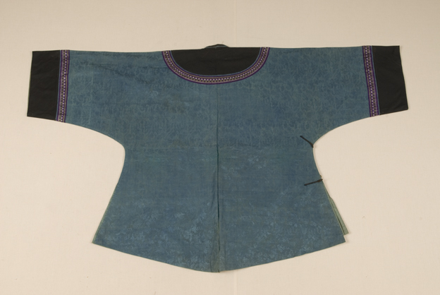 描述:该女衣,交领右衽,宽袖,圆下摆。主要面料为蓝色皮球花纹绸。皮球花纹其花卉外形呈小圆形,但里面的花样却可以较为任意。它最大的特点是排列的方式,呈“么”、“么二”、“二三”等不同形式。
