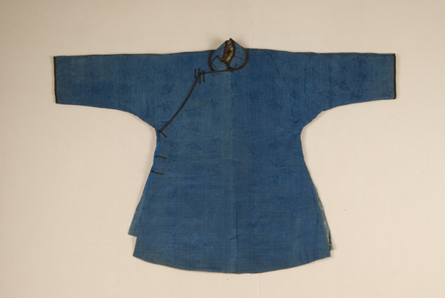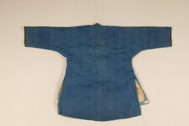 描述:该袄,右衽、窄袖、平摆,两端开衩。面料为宝蓝色云鹤纹绸,内衬皮毛。采用比较简洁的一字扣。
