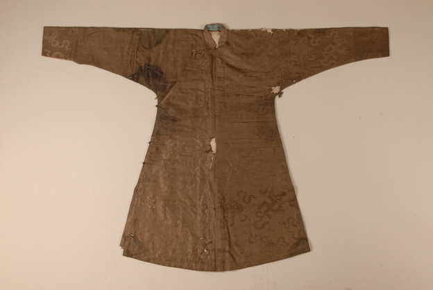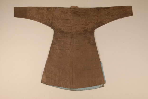 描述:该长衫,右衽交领,窄袖、圆下摆,两端开衩。面料为浅褐色万事如意纹绸,内有夹棉。采用比较简洁的一字扣。