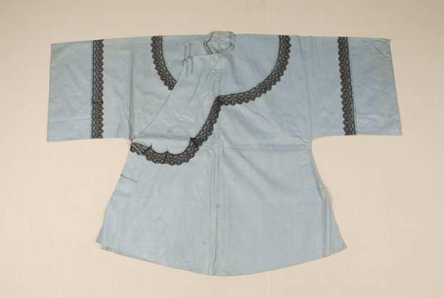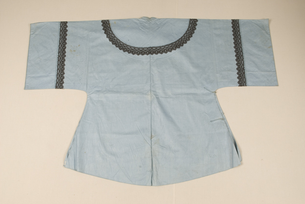 描述:此件女衣立领,大襟,宽身收腰,袖口宽大,两侧开衩,下摆略圆,无衬里,使用盘扣。衣服面料使用浅蓝色素织物,领口、袖子等处镶有黑色花边。