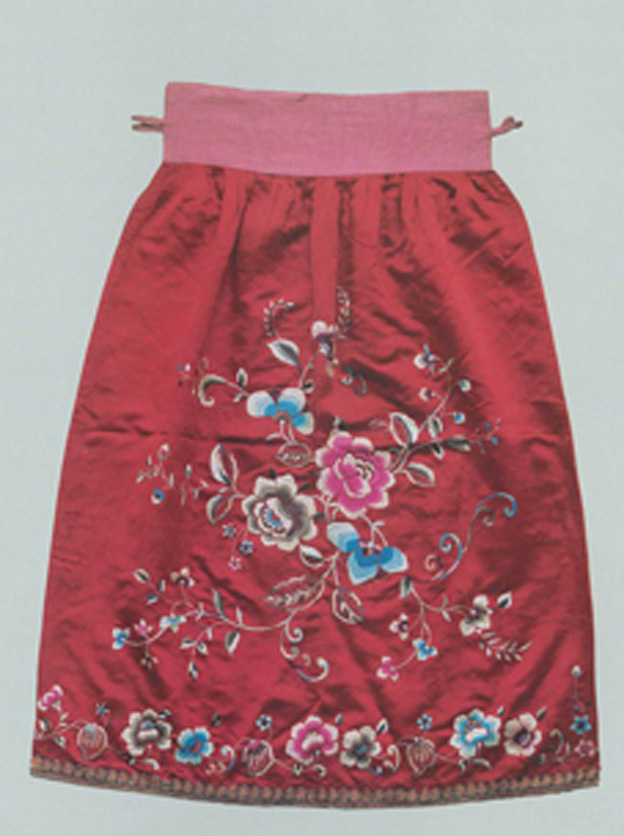 这条应该为女子婚嫁时所穿的“红喜裙”。裙为民国时期流行的套穿裙式,裙腰为红粉色平纹棉布,两端中间钉有布袢,前后二片缝合,在两侧开衩22厘米。裙周身不规则打抽褶,用以束腰。此裙面料为大红色素缎,用彩色丝线绣出穿枝牡丹花卉纹,以大朵牡丹为中心,上下穿插蓝色花蕾,四周延伸出枝叶和花苞。下摆缘也饰有彩绣折枝牡丹并钉有穿珠桃形蕾丝边饰。此裙图案华丽,充满喜气。
