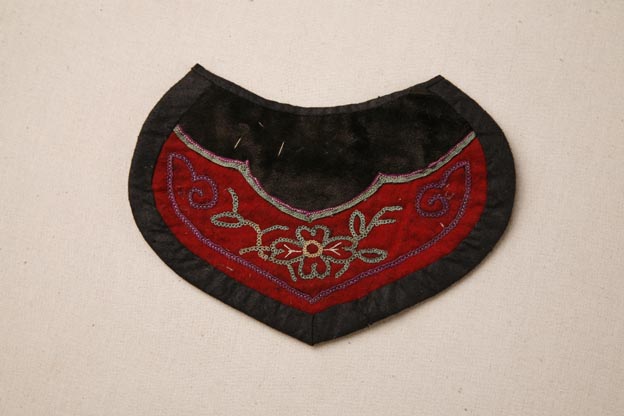该绣品为一口围片,在中间一块红色绒地上用拉锁绣彩绣花卉,周围用黑色素缎镶边。