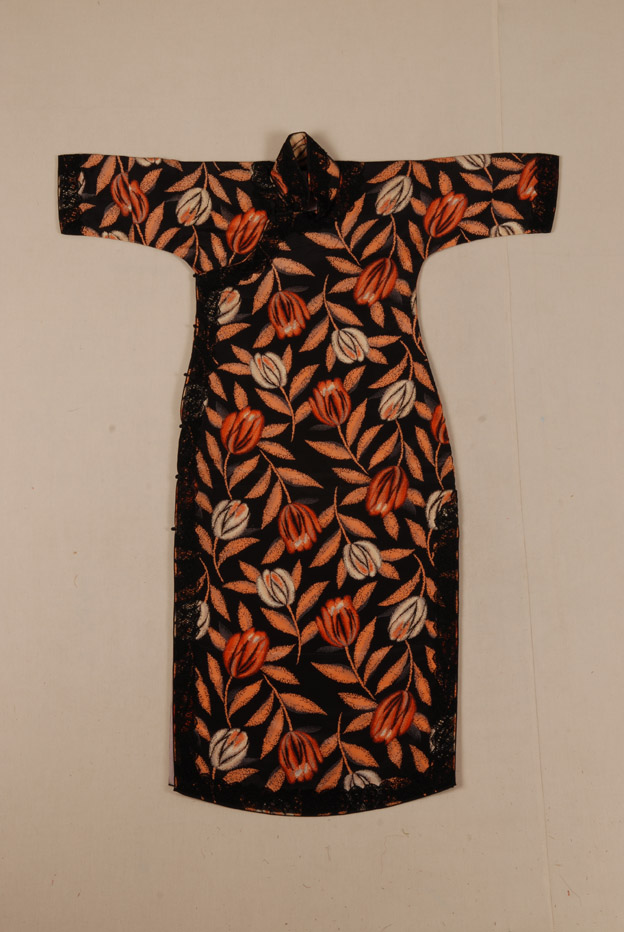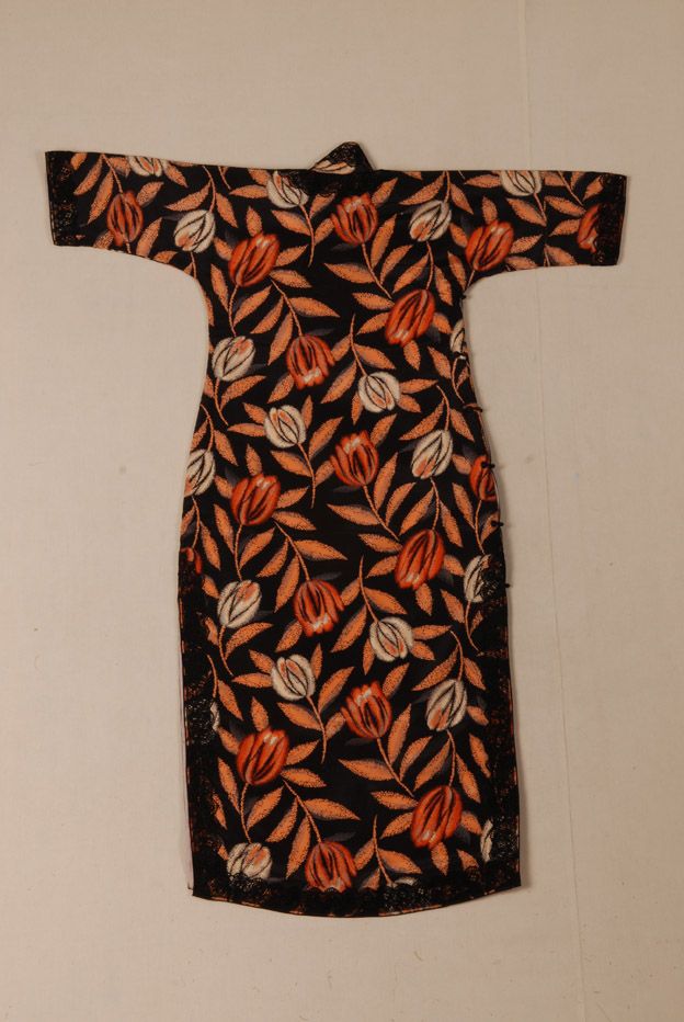 描述:该旗袍,中高立领,短袖,窄袖口,右衽,一字扣。下摆左右两边开衩。面料为黑绸印郁金香花,夹绒。领缘、襟缘和下摆等处镶有黑边。