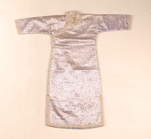 描述:该旗袍,中高立领,中袖,窄袖口,右衽,一字扣。下摆左右两边开衩。面料为藕色散点花缎,夹绵。领缘、襟缘、袖口和下摆等处镶有浅色花边。