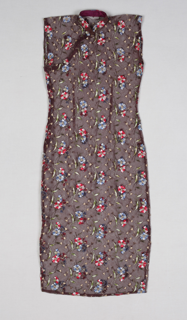 描述:该旗袍,立领,无袖,右衽。下摆左右两边开衩。面料为褐色珠罗纱,其上彩绣花卉。无衬。