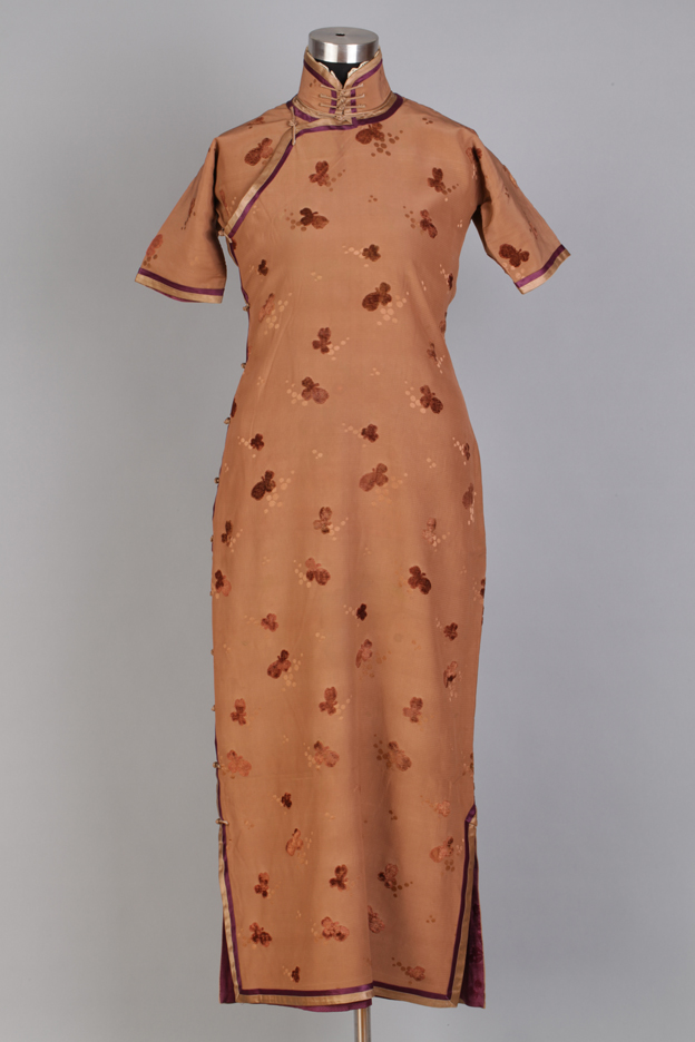 描述:该旗袍,中高立领,短袖,窄袖口,右衽,一字扣。下摆左右两边开衩。面料为咖啡色织绒绉绸,暗花绸衬里。