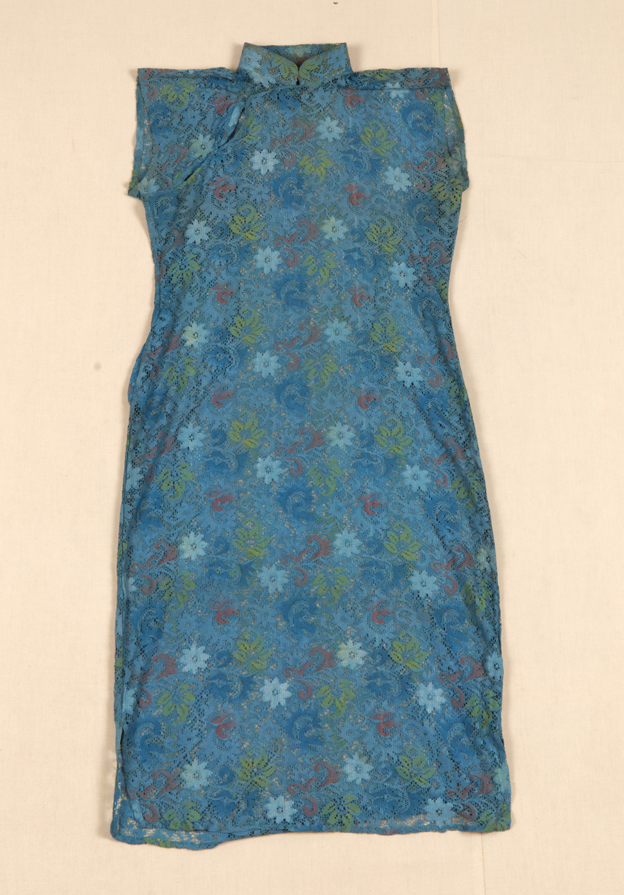 描述:该旗袍,立领,无袖,右衽。下摆左右两边开衩。面料为蓝色纱地,其上印花,无衬。