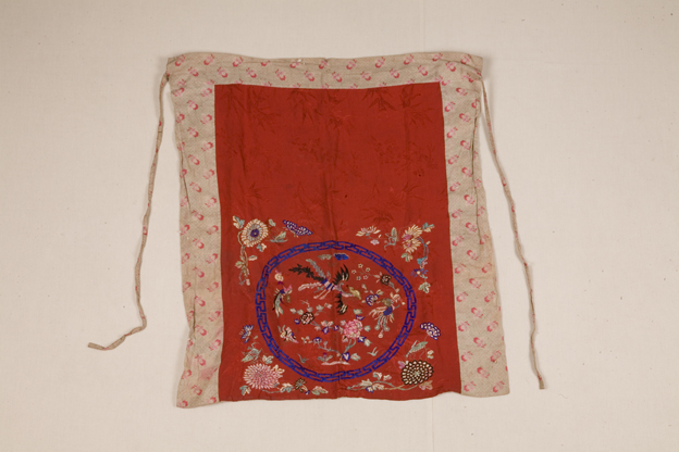 描述:该裙称为抱裙,以大红色绸料为地,其上用红色、蓝色、黑色等多种彩色丝线绣大窠凤鸟花卉纹样。主要的针法为平针。