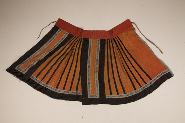 描述:此裙裙身面料为红色暗花绸,现褪色严重,呈橙红色,两侧压黑色素缎,内为绿色暗花绸衬里。下摆、马面等两侧以宽条黑色素缎及蓝地机织花边镶饰。