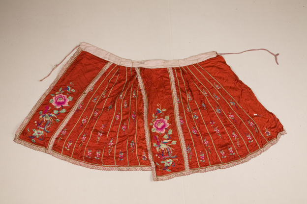 描述:该裙以大红素缎为地,其上彩绣凤采牡丹。主要的针法为平针。绢作衬。腰头缝以白布。这种制法可以说从裙腰开始就将吉祥的寓意寄托其中,白布喻意“白头偕老”。