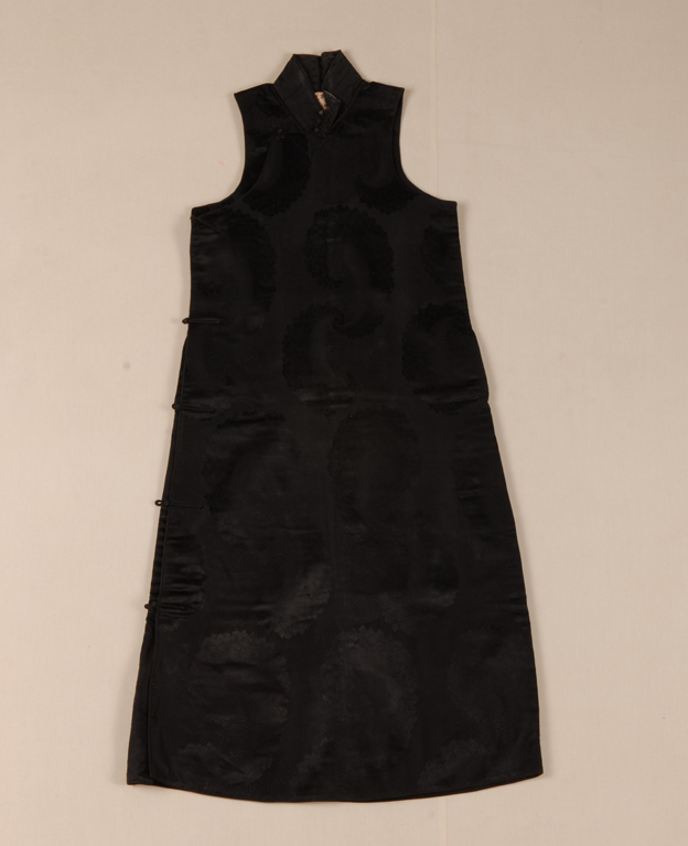 描述:马甲是民间的称呼,清宫内称为褂襕。该马甲,长至膝下,圆领,一字扣。面料为黑色大花卉绸,夹绵,印花棉布作衬。