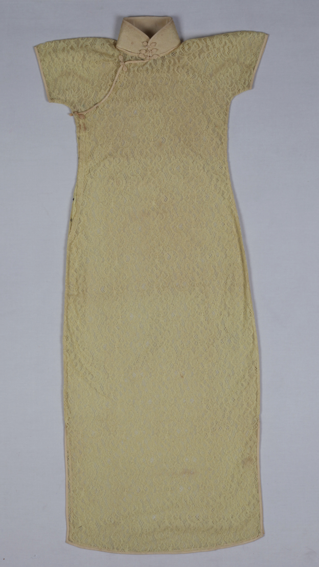 描述:该旗袍,中高立领,无袖,右衽,一字扣。下摆左右两边开衩。面料为黄色漏空纱,无衬。