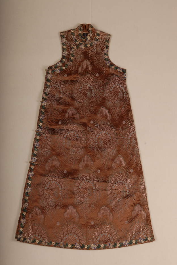 描述:此件长马甲以浅棕色卷草团花纹织锦缎为面料,立领斜襟,无袖,领、袖笼、襟缘用花边镶滚,款式与清末褂襕较为接近,但已不使用繁复的一道道花边镶嵌,显得简洁。