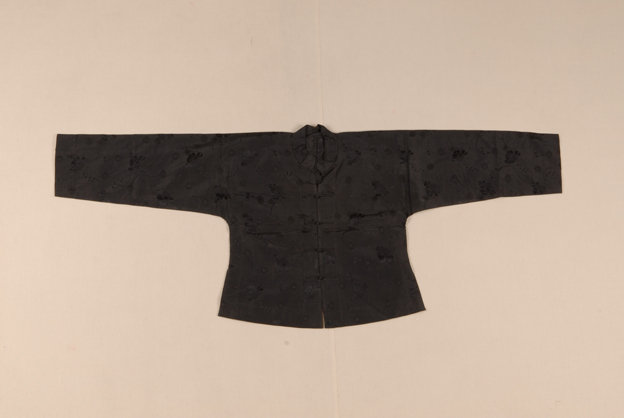 描述:此件为儿童穿着的马褂,立领,对襟,四开衩,一字扣。其面料使用实地纱织物,基础组织为1/1平纹地上以绞纱组织及纬浮长起花,图案为花卉寿字纹样,无衬里。
