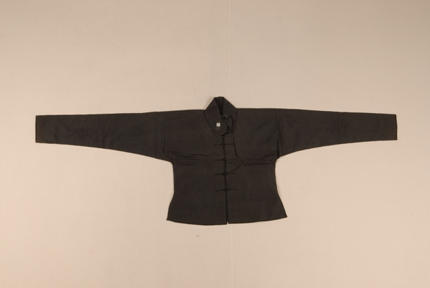 描述:马褂,一般穿在长袍外面。清代,受到广大百姓的崇尚,尤其是商人往往以穿马褂为时髦之标志,《都门杂咏》有这样的诗句:“珍珠袍套属官曹,开禊衣裳势最豪。商贾近来新学得,石青马褂出风毛。” 该马褂,对襟,两边开衩。面料为黑色暗花绸。