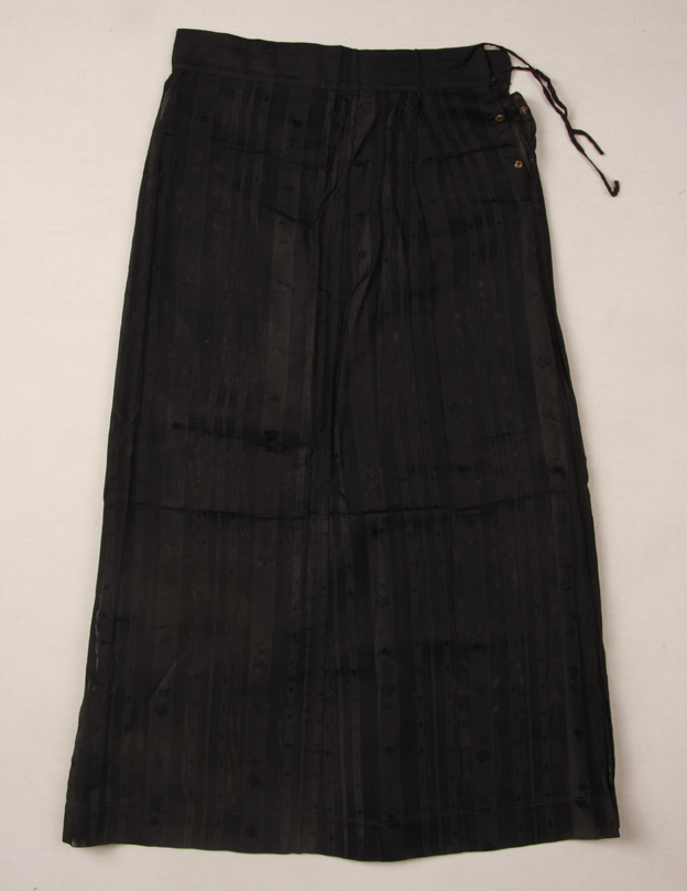 描述:此裙裙身面料为黑色暗花丝织物,正反缎与绞经交替间隔成竖条纹,无衬里。裙腰部分开衩,以布襻系绳子来扎腰。