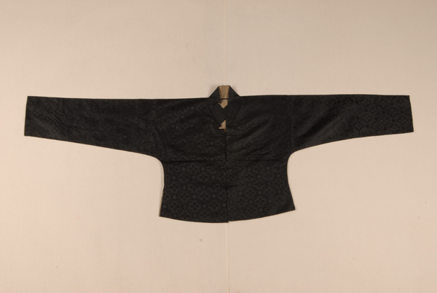 描述: 马褂,一般穿在长袍外面。清代,受到广大百姓的崇尚,尤其是商人往往以穿马褂为时髦之标志,《都门杂咏》有这样的诗句:“珍珠袍套属官曹,开禊衣裳势最豪。商贾近来新学得,石青马褂出风毛。” 该马褂,对襟,两边开衩。面料为黑色柿蒂花缎。