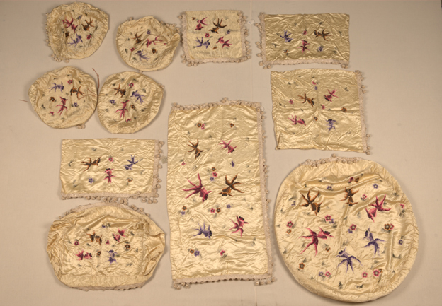 描述:该套织物共有十一件,保存较为完整,以缎织物为底,其上用彩色丝线绣出金鱼、水藻及桃花纹样,色泽艳丽,并镶有边饰及球状垂坠饰物。