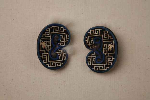 描述:此耳套外形为耳朵形状,黑缎面,兔毛里,宝蓝色镶边,面上绣白色勾连纹样,非常别致。