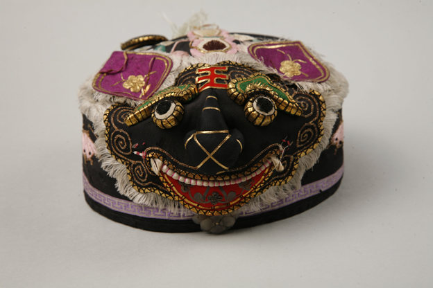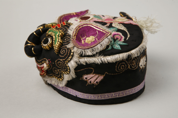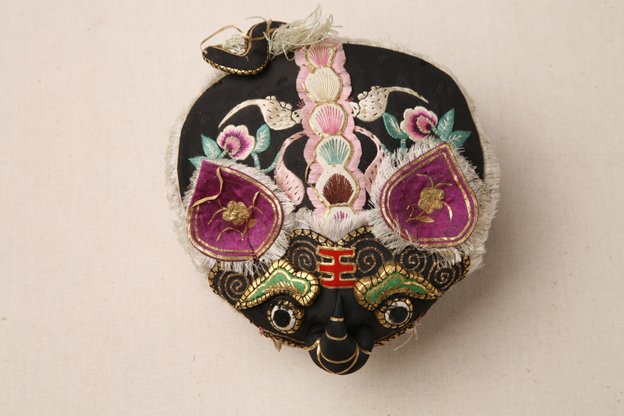 描述:此件虎头帽以黑缎为地,紫色、绿色、粉色、白色,大胆的色彩搭配,把浓厚的乡土气息散发无已。
