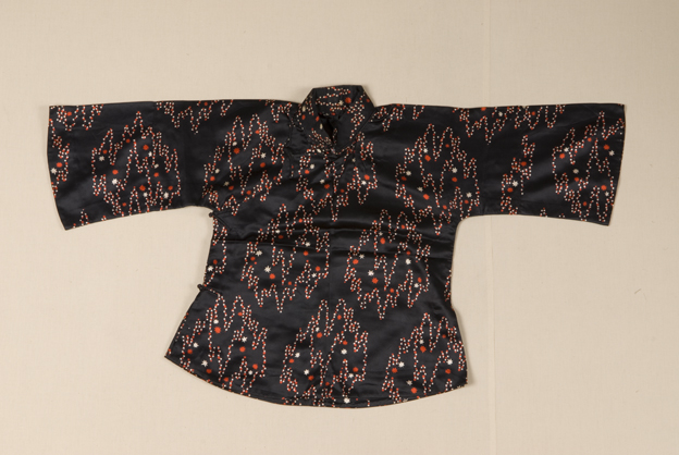该女衣,采用黑色素缎为地,其上印有红白两色的几何纹样。