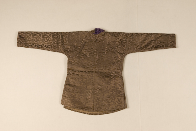 描述: 该夹袄,圆领、斜襟。面料为棕色花卉纹暗花缎。紫色绢作衬。