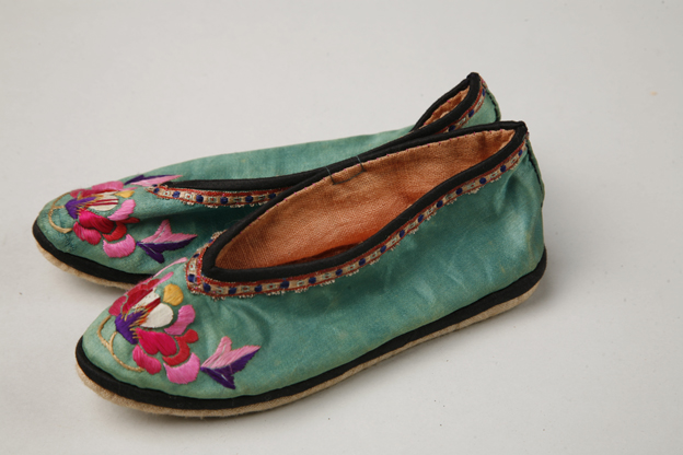 描述:此小脚鞋为绿缎地,红衬里,黑缎边,并镶有绦边,在鞋脸上彩绣花卉纹,做工纹样比较质朴。