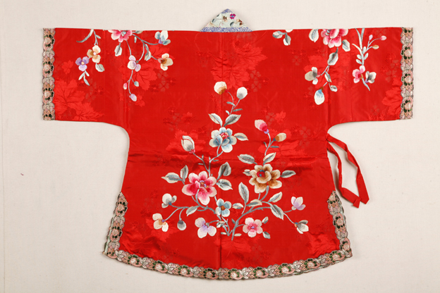 描述:此件为女童所穿之上衣,中袖,大襟,两侧开衩,使用系带,衣服的主要面料为大红色花卉纹暗花绸,其上用彩色丝线绣出山茶花图案,下摆、袖口等处缝有花边装饰,领子处以贴缝绿色素缎制成如意头装饰,其上彩绣花卉。