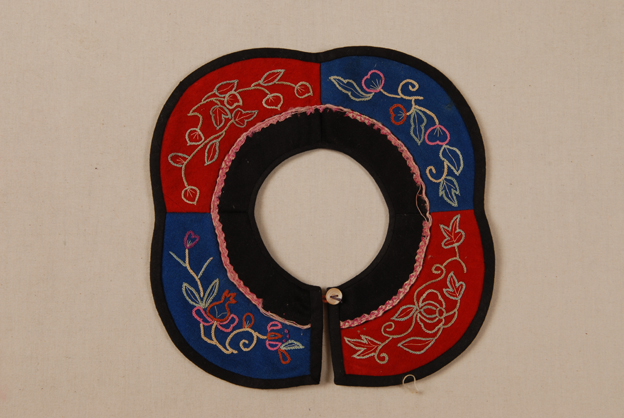 描述:该绣品为一口围,主要面料为红蓝色绒。其上拉锁绣花卉纹样。拉锁绣,也称拉锁子、打倒子,运用的是缠绕针绣法。经常用加捻的丝线或捻金线、捻银线绣作。须用大小两根针各穿一线,绣时大针要全线引出绣面,小针则从绣料的反面刺出,露出半根针,大针引线缠绕小针一圈,形成一个线圈,然后将小针引出把大针的线圈钉住,以此循环。口围片周边镶有黑色小边。