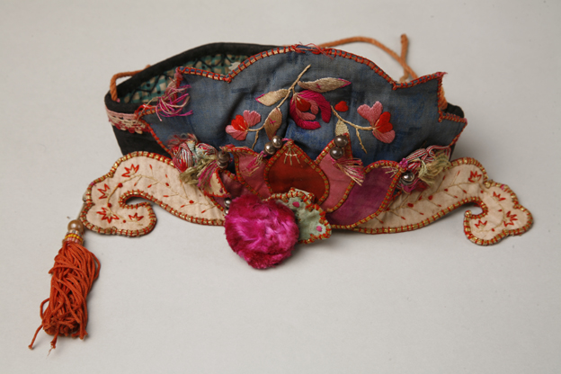 描述:该童冠饰,以红蓝等色彩缎制成荷花形。蓝色缎上彩绣花卉纹样,针法以套针为主。缎料周边钉金绣点缀。冠饰前方缀有绒球一个。