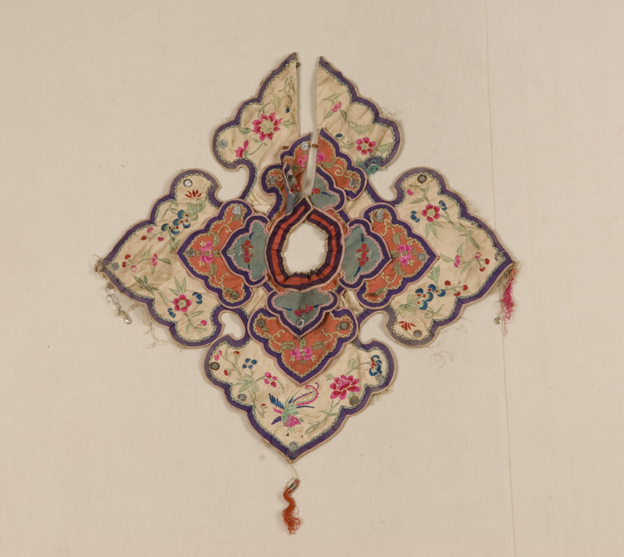 描述:该件云肩如意头四出,为典型的四合如意式云肩,其主要面料为白色红色及绿色素缎织物,其上以彩色丝线绣出花鸟纹样,原当缝有穗子等装饰物,今几已不存。