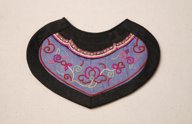 描述:该绣品为一口围片。中央紫色人字纹绫地上采用拉锁绣,绣出花卉纹样。拉锁绣,也称拉锁子、打倒子,运用的是缠绕针绣法。口围片周围用黑色素缎缘边。