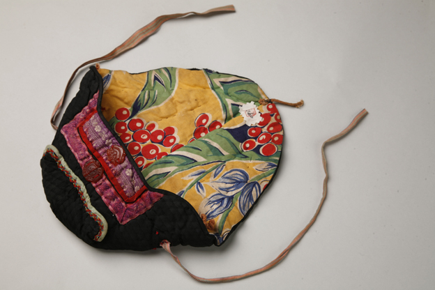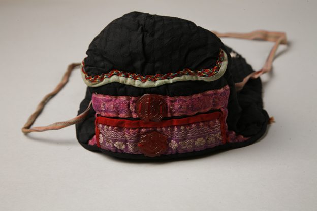 描述:该童风帽主要面料为黑绸。帽沿镶有三根彩色小绦带,并缀有两颗玉饰。帽身垂有系带。