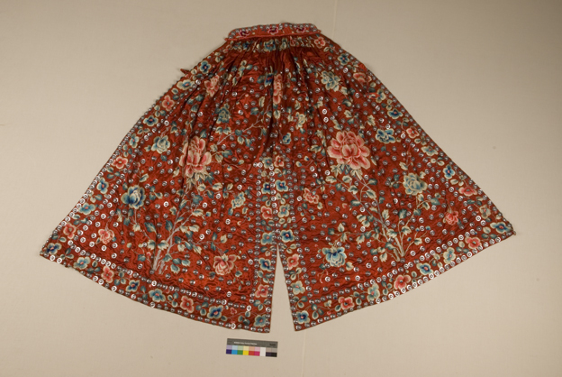 描述:这件斗蓬的主要纹样为红、蓝二色折枝牡丹,边饰为红、蓝二色海棠花。花瓣用二晕、三晕法。寓意“富贵满堂”。著名京剧演员的苟慧生演出“贩马记”曾使用此件斗篷。