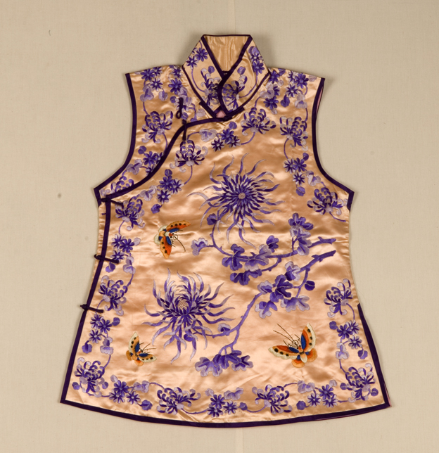 描述:此件坎肩立领,大襟,衣身较为宽大,使用盘扣五颗。衣身的主要面料为黄色素缎,其上用彩色丝线绣出蓝色菊花及三只彩色的蝴蝶纹样,有衬里。