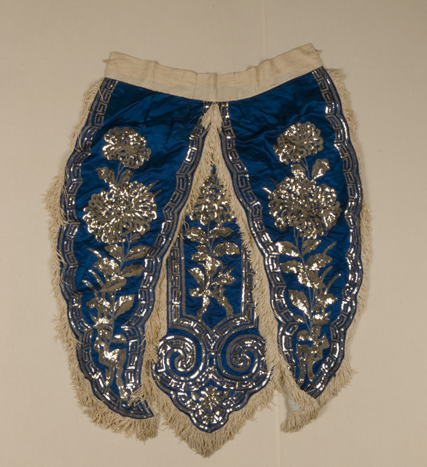 描述:此为京剧中的武将装扮所用,该靠把为女子所用,以宝蓝色素缎制成,有衬里,也称“软靠”。靠背边呈波浪形,并缀以白色流苏,上以钉珠绣的技法绣出菊花纹样,腰部面料则以白色棉布制成。此为京剧中的武将装扮所用,该靠把为女子所用,以白色绉绸制成,有衬里,也称“软靠”。靠背边呈波浪形,沿边彩绣以花卉图案,腰部面料则以白色棉布制成。
